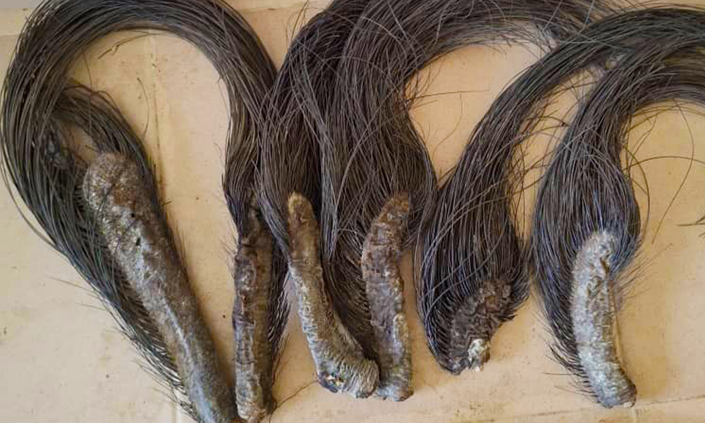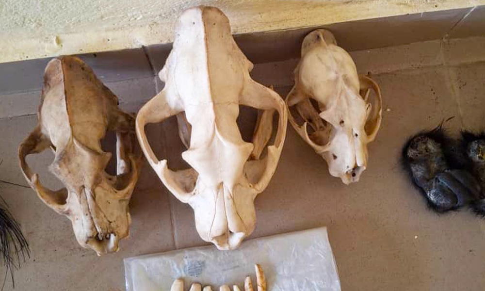 A lawless individual transporting eleven hornbill heads, five panther skins, six elephant tails, three mandrill skulls, one gorilla skull, four gorilla hands, seven mandrill teeth, eight red-tailed parrot heads, and four bundles of red-tailed parrot feathers in a vehicle was arrested.